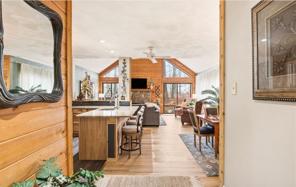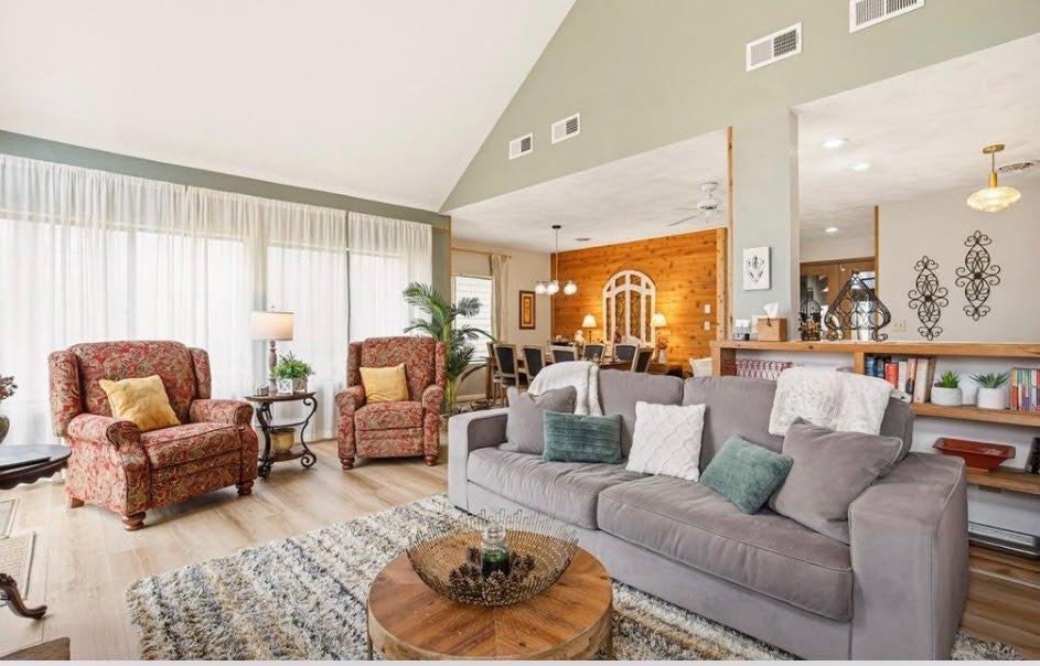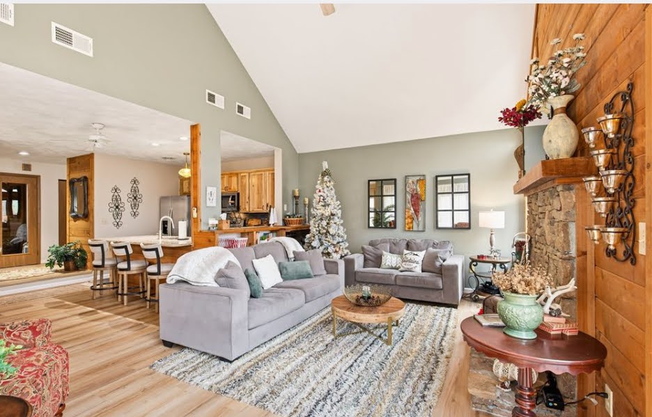 🛋️ Open-concept living area with comfortable seating and fireplace